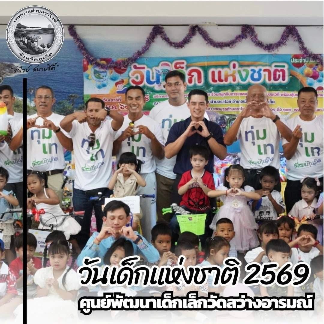 วันนี้ (9 มกราคม 2569) นายเทมส์ ไกรทัศน์ นายกเทศมนตรีตำบลราไวย์ คณะผู้บริหาร สมาชิกสภาเทศบาล คณะครู และเจ้าหน้าที่กองการศึกษา เทศบาลตำบลราไวย์ จัดกิจกรรมวันเด็กแห่งชาติ 2569 เพื่อให้ความสำคัญของเด็กและเยาวชน พัฒนาคุณภาพชีวิตที่ดี ณ ศูนย์พัฒนาเด็กเล็กวัดสว่างอารมณ์ ตำบลราไวย์ อำเภอเมือง จังหวัดภูเก็ต